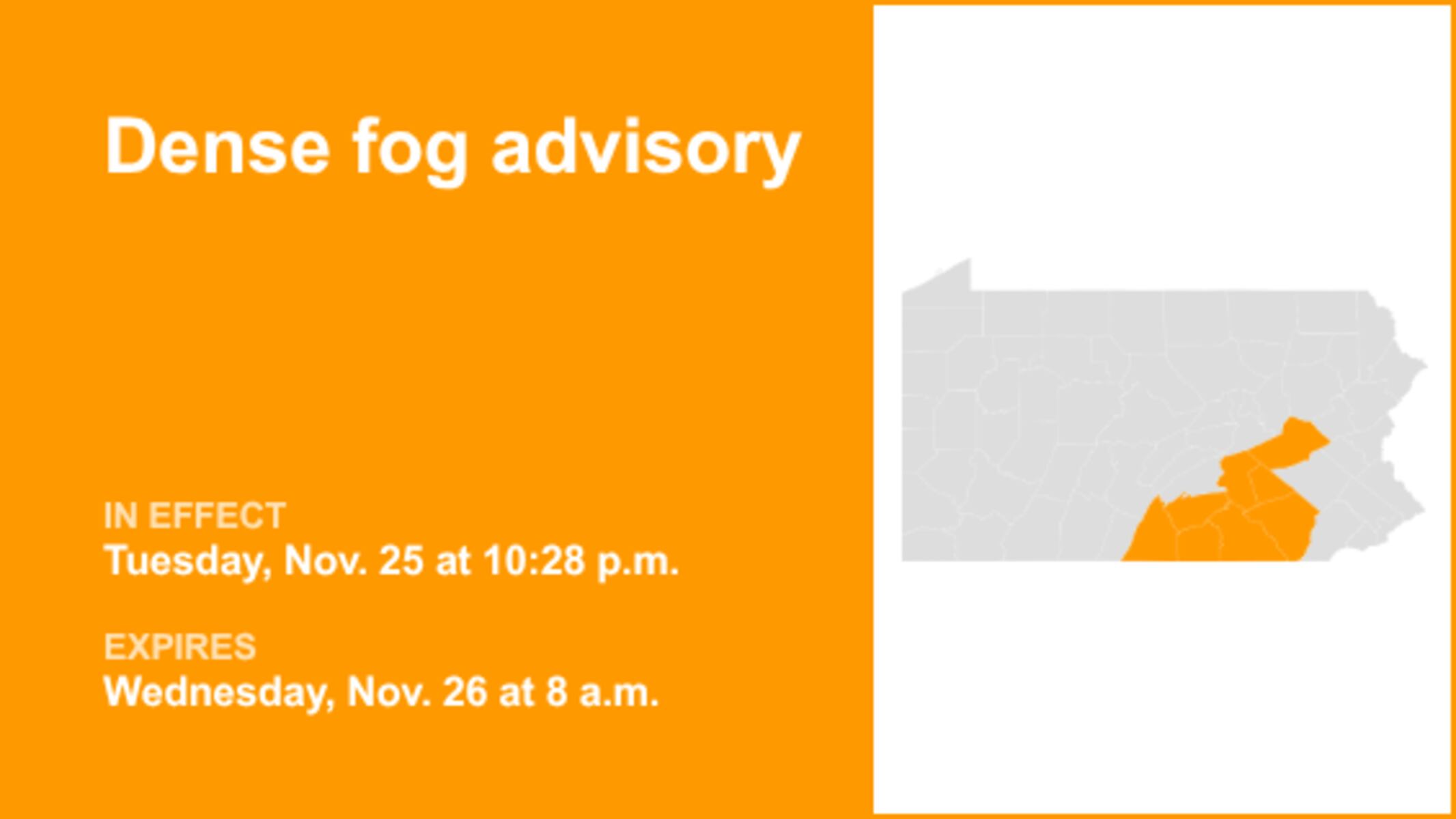 URGENT UPDATE: A dense fog advisory has been issued for South Central Pennsylvania as visibility drops to a dangerous 1/4 mile. The advisory, released by the National Weather Service at 10:28 p.m. on Tuesday, remains in effect until 8 a.m. on Wednesday, affecting Franklin, Dauphin, Schuylkill, Lebanon, Cumberland, Adams, York, and Lancaster counties.